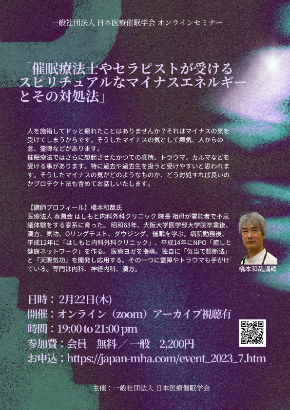 | 日本医療催眠学会 オンラインセミナー 「催眠療法士やセラピストが受けるスピリチュアルなマイナスエネルギーとその対処法」 (終了) |